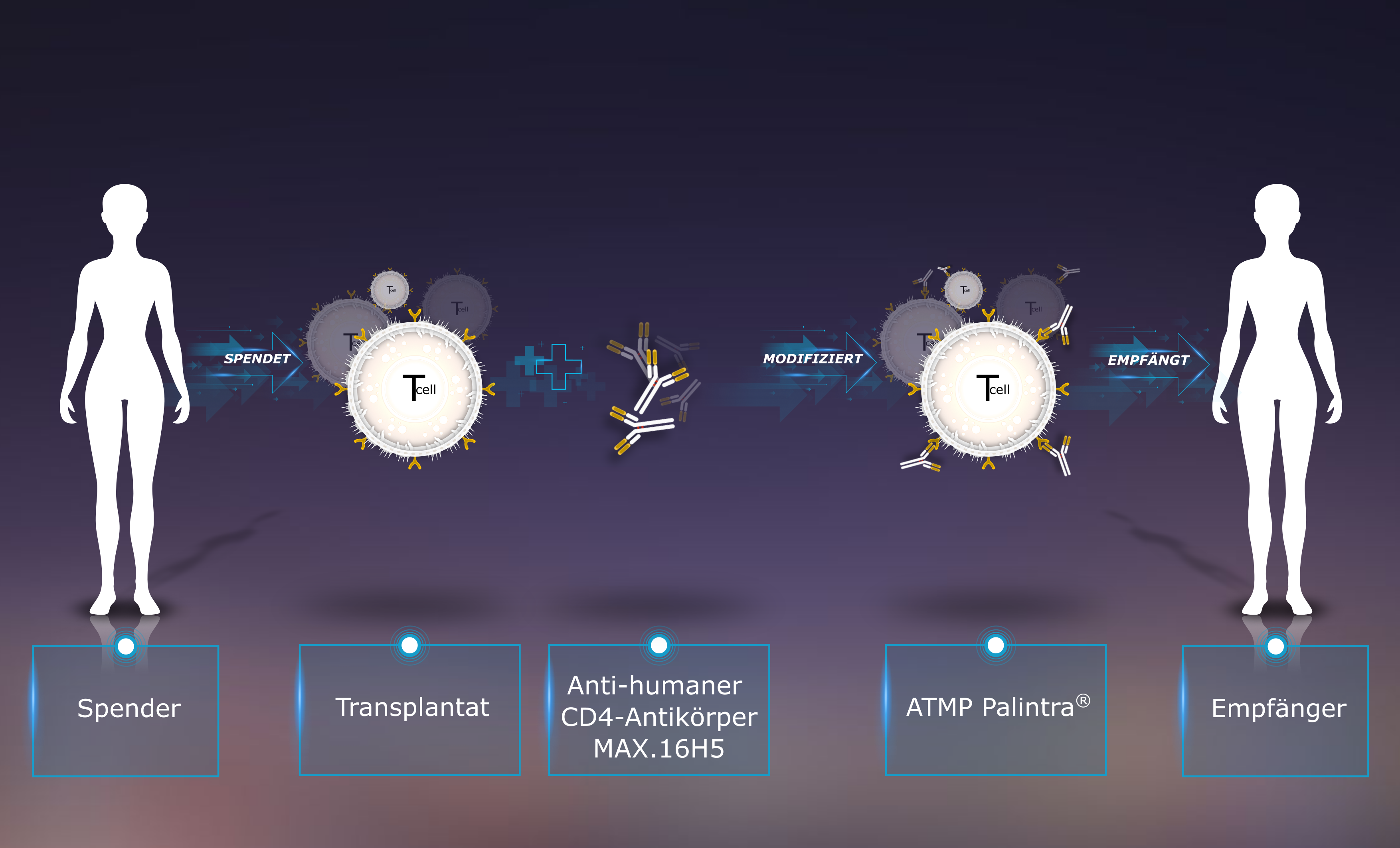 mobilisiertes Zelltransplantat. Dieses wird in einem definierten Prozess unter sterilen Bedingungen mit dem Anti-CD4-Antikörper MAX.16H5 inkubiert. Der Herstellungsprozess gewährleistet eine nur geringe Menge freier Antikörpermoleküle im finalen ATMP Palintra®.